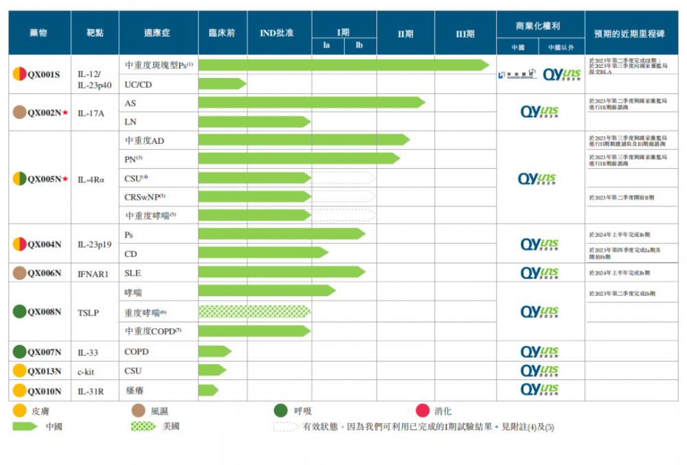 截至该日,荃信生物的管线中包含QX001S(一款处于银屑病(Ps)III期临床试验的IL-12/IL-23p40抑制剂及有望成为中国首个获批的乌司奴单抗生物类似药);QX002N(一款处于II期临床试验的IL-17A抑制剂,治疗强直性脊柱炎(AS)方面拥有理想疗效);及QX005N(一款经充分验证阻断IL-4Rα的单克隆抗体(mAb),可应用于广泛适用症的广泛作用靶点)。