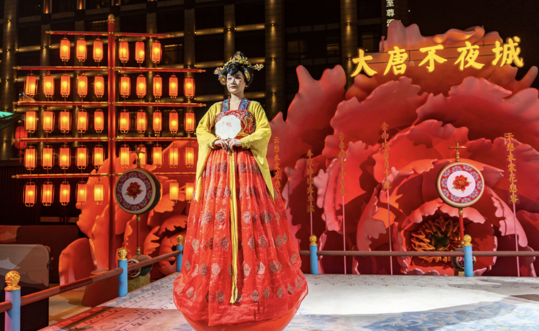 “大唐不夜城”最早走红的“不倒翁小姐姐”,起初只是运营方策划的街头互动表演。但一则“牵手视频”的慢镜头中,其令人沉醉的容颜和一颦一笑的唐风韵味迅速大火,让不少游客们有了在现场拍摄同款视频的想法。于是,“不倒翁小姐姐”也和“威震天”一样成为了当地的“明星项目”,吸引游客纷纷前来打卡。