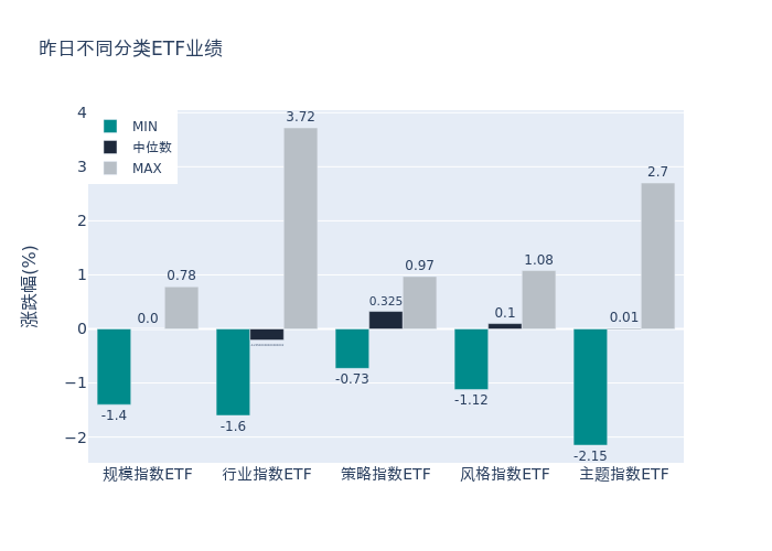 昨日股票型ETF收益率中位数为0.0%。其中按照不同分类,规模指数中300价值A收益率最高,为0.78%;行业指数中国泰中证全指通信设备ETF收益率最高,为3.72%;策略指数中山证红利ETF收益率最高,为0.97%;风格指数中上证180价值ETF收益率最高,为1.08%;主题指数中新华中证云计算50ETF收益率最高,为2.7%。