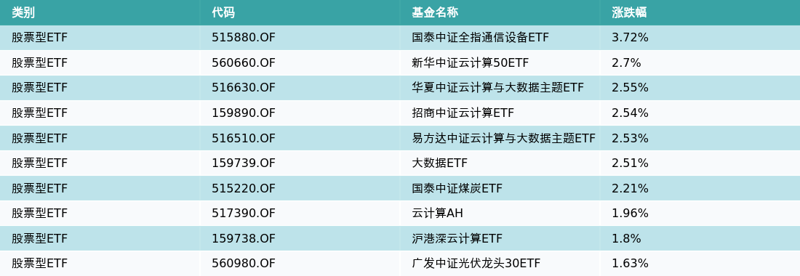 昨日股票型ETF涨幅最高的3支ETF及其收益率分别为:国泰中证全指通信设备ETF(3.72%)、新华中证云计算50ETF(2.7%)、华夏中证云计算与大数据主题ETF(2.55%)。涨幅前10详情见下表: