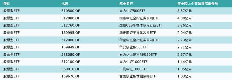昨日股票型ETF资金流出最多的3支ETF及其流入金额分别为:南方中证500ETF(流出8.57亿元)、国泰中证全指证券公司ETF(流出4.38亿元)、国泰CES半导体芯片行业ETF(流出3.26亿元)。资金流出前10详情见下表: