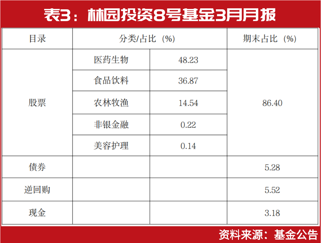 4月12日,某金融数据终端发布了林园投资8号基金(以下简称“8号基金”)的3月度报告,该基金的基金经理为林园。具体来看,在8号基金3月资产配置中,股票资产占比为86.4%,债券为5.28%,逆回购为5.52%,现金为3.18%。在股票资产配置中,医药生物占比最高为48.23%,食品饮料为36.87%,农林牧渔、非银金融、美容护理占比分别为14.54%、0.22%、0.14%(见表3)。
