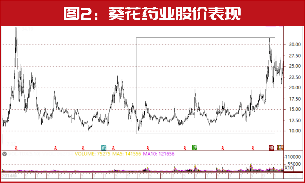 拉长周期来看,香港中央结算有限公司在近年均在连续不断加码,2018年三季报时,香港中央结算有限公司新进成为葵花药业前十大流通股股东,当时持仓843.49万股,此后,多次加仓。截至2022年年报,持股数量达到历史最高值。在此期间,葵花药业股价低位反弹,如2019年~2022年底,公司股价累计涨幅达100%(见图2)。
