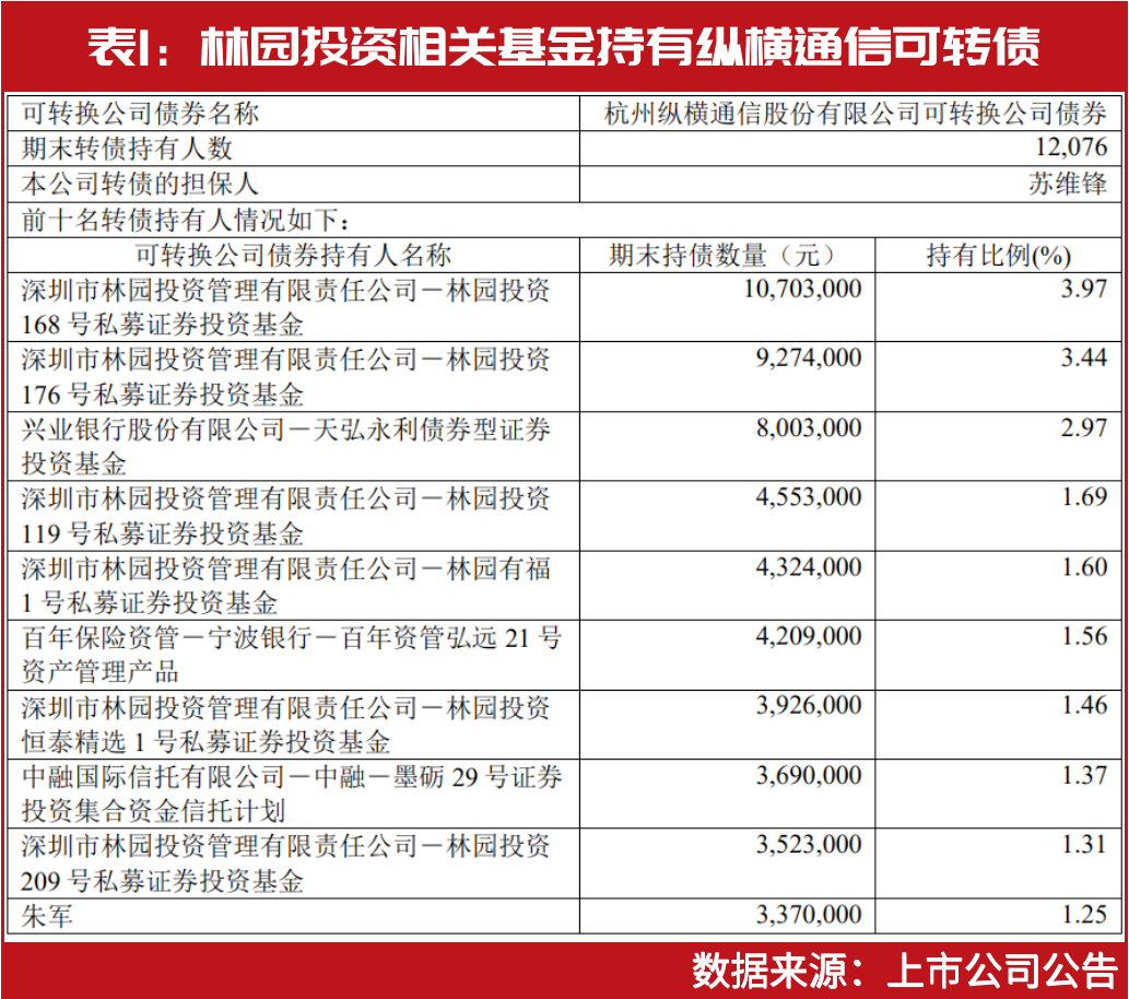 据纵横通信发布的报告期末可转债持有人名单中,林园投资168号、林园投资176号、林园投资119号等多只基金现身持有。其中,林园投资168号基金期末持有金额最高,为1070万元(见表1)。