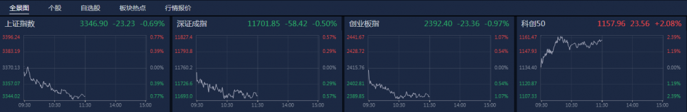 市场早盘震荡调整,三大指数均小幅下跌,科创50涨超2%。截至上午收盘,沪指跌0.69%,深成指跌0.5%,创业板指跌0.97%,科创50涨2.08%。