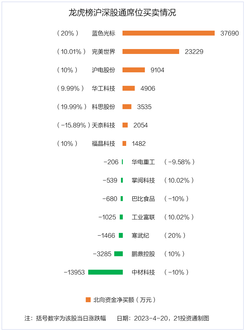 4月20日,上证指数下跌0.09%,深证成指下跌0.37%,创业板指下跌1.2%。盘后龙虎榜数据显示,共有48只个股因当日异动登上龙虎榜,资金净流入最多的是蓝色光标(300058.SZ),达7.65亿元。