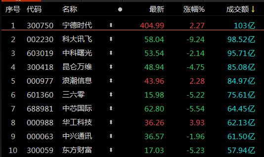 其中,宁德时代成交额居首,为103亿元。其次是科大讯飞、中科曙光、昆仑万维、浪潮信息,成交额分别为98.5亿元、95.7亿元、85亿元、85亿元。