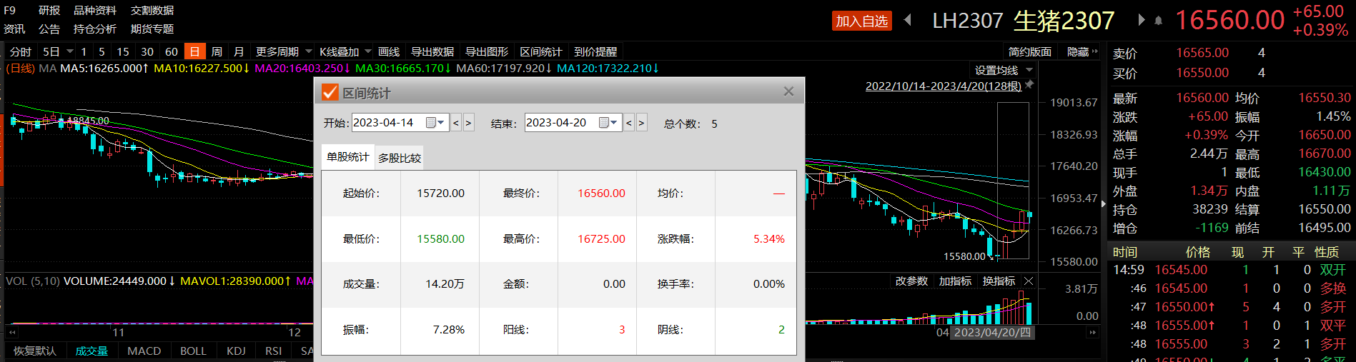 期货方面,今日生猪期货主力2307合约上涨0.39%,收报于16560元/吨。东方财富Choice数据显示,生猪期货主力2307合约自4月14日低点反弹了5.34%。