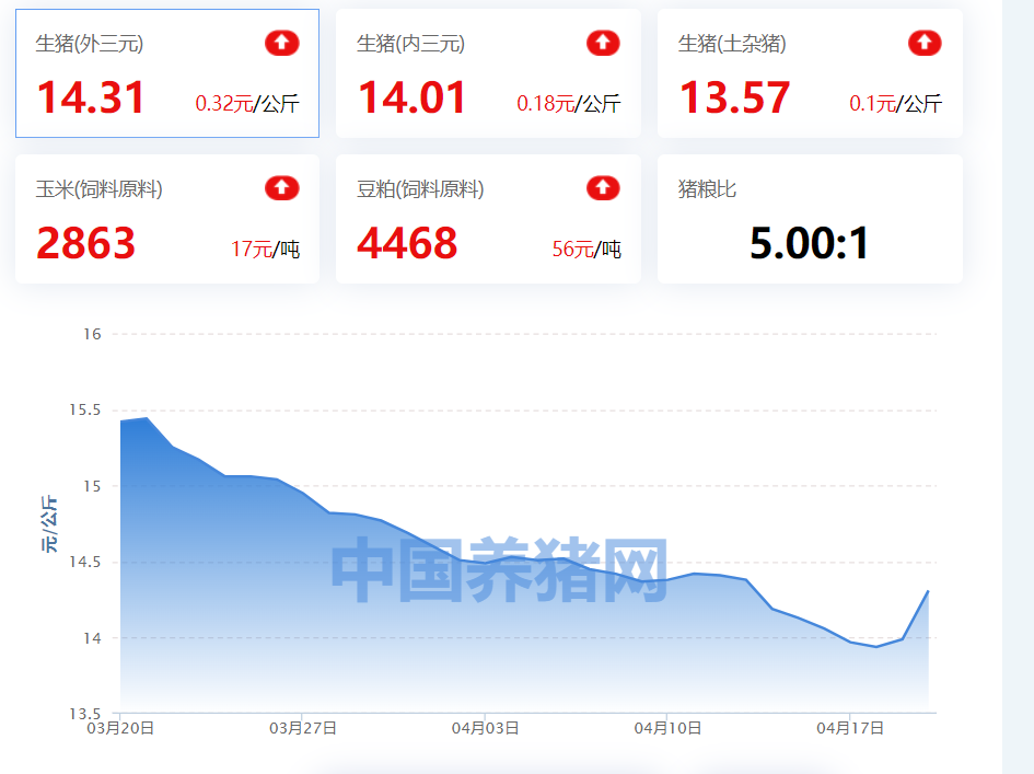 中国养猪网数据显示,4月20日,全国猪价(外三元)价格回升至14.31元/公斤,全国猪价(内三元)价格回升至14.01元/公斤,全国生猪价格(土杂猪)回升至13.57元/公斤。