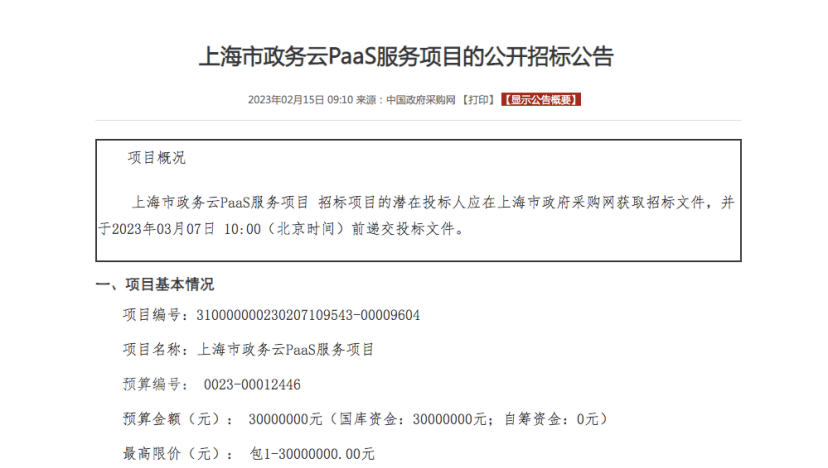 2023年2月15日,上海市大数据中心发布《上海市政务云Paas服务项目》招标公告,预算3000万元,并于3月16日发布中标结果:上海联通(联合体:上海移动、上海电信)3000万元(中)。