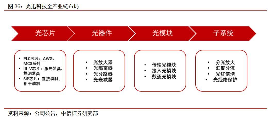 同时,深耕行业二十余年,通过一系列增资、并购,公司当前已构建起从芯片到器件、再到模块、子系统的综合解决方案,具备光通信全产业链垂直整合能力,是国内少数在芯片、模块、系统全产业链同时布局的光通信企业。