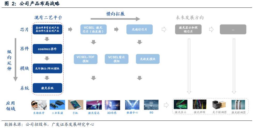 而依托在激光芯片领域的技术及经验积累,公司当前已将业务扩展布局至光通信芯片、VCSEL芯片、激光芯片、器件及模块等领域,形成了较为完善的产品系列和种类。