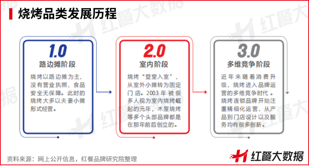 直到近年来,烧烤品类才进入连锁化发展阶段,涌现了不少潜力品牌。总的来看,烧烤可以分为以上三个发展阶段。
