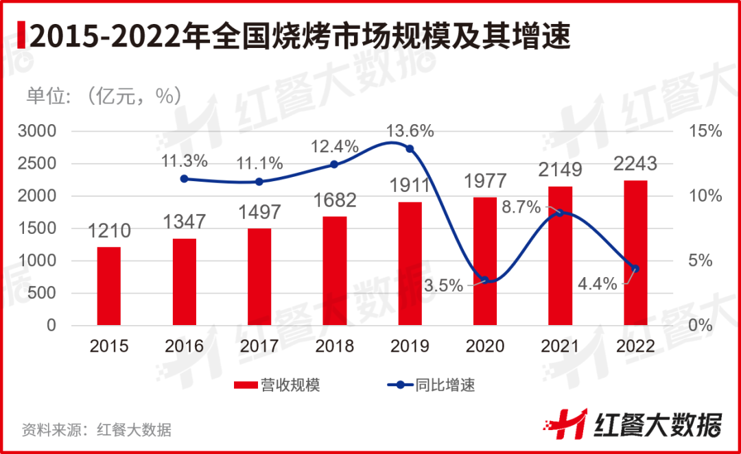 经过多年的发展,烧烤品类已经积累了庞大的消费群体,加上夜经济的助力,其市场规模也在持续增长,2022年烧烤品类市场规模突破了2200亿元。