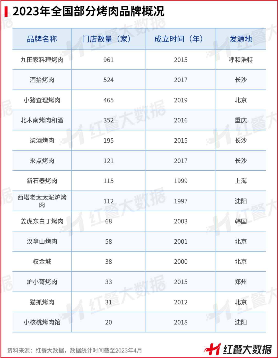 从品牌竞争格局上看,目前烤肉品类呈现“一超多强”的局面,而烤串品类暂无绝对的巨头品牌。2015年起家于呼和浩特的九田家料理烤肉是门店数量最多的烧烤品牌。据红餐大数据,截至2023年4月,其门店数达到了961家,远超其他烤肉品牌。