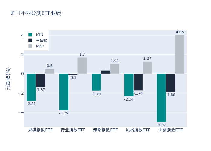 昨日股票型ETF收益率中位数为-1.415%。其中按照不同分类,规模指数中A50ETF收益率最高,为0.5%;行业指数中中证银行ETF收益率最高,为1.7%;策略指数中国泰富时中国国企开放共赢ETF收益率最高,为1.04%;风格指数中招商中证银行AH价格优选ETF收益率最高,为1.27%;主题指数中华夏中证动漫游戏ETF收益率最高,为4.03%。
