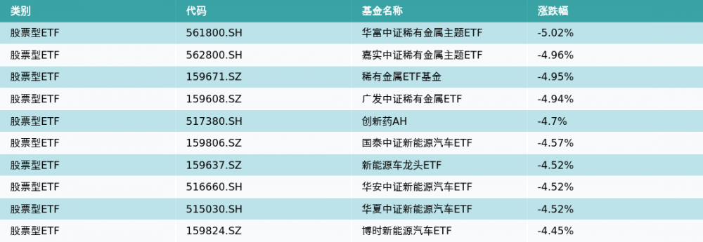 昨日股票型ETF跌幅最大的3支ETF及其收益率分别为:华富中证稀有金属主题ETF(-5.02%)、嘉实中证稀有金属主题ETF(-4.96%)、稀有金属ETF基金(-4.95%)。跌幅前10详情见下表: