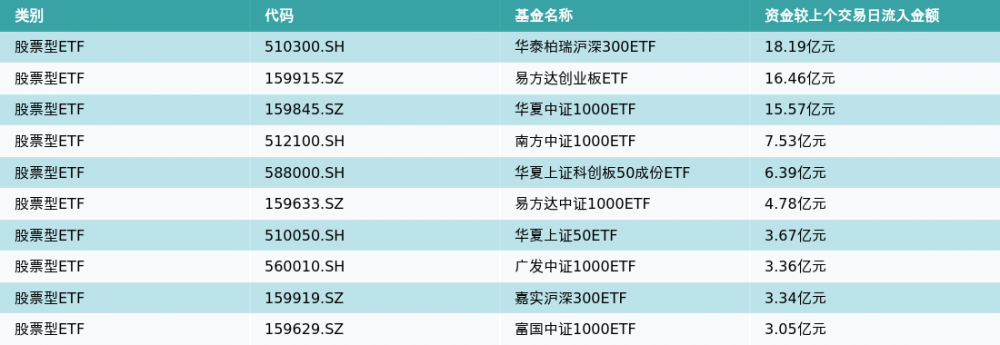 昨日股票型ETF资金流入最多的3支ETF及其流入金额分别为:华泰柏瑞沪深300ETF(流入18.19亿元)、易方达创业板ETF(流入16.46亿元)、华夏中证1000ETF(流入15.57亿元)。资金流入前10详情见下表: