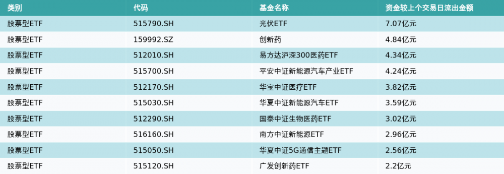 昨日股票型ETF资金流出最多的3支ETF及其流入金额分别为:光伏ETF(流出7.07亿元)、创新药(流出4.84亿元)、易方达沪深300医药ETF(流出4.34亿元)。资金流出前10详情见下表: