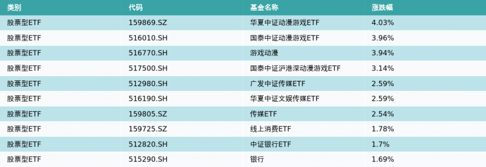 昨日股票型ETF涨幅最高的3支ETF及其收益率分别为:华夏中证动漫游戏ETF(4.03%)、国泰中证动漫游戏ETF(3.96%)、游戏动漫(3.94%)。涨幅前10详情见下表: