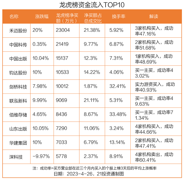 4月26日,上证指数下跌0.02%,深证成指上涨0.33%,创业板指上涨1.54%。盘后龙虎榜数据显示,共有64只个股因当日异动登上龙虎榜,资金净流入最多的是禾迈股份(688032.SH),达2.3亿元。