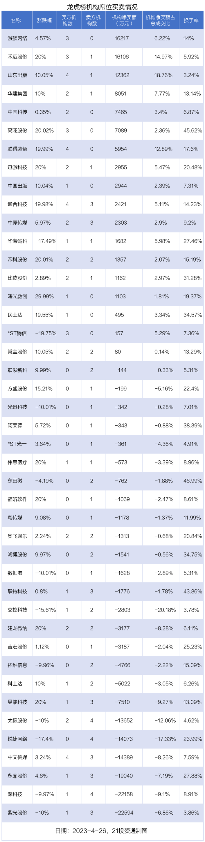 4月26日,43只个股龙虎榜出现了机构的身影,机构合计净卖出5.37亿元。具体来看,机构净买入18股,净卖出25股。