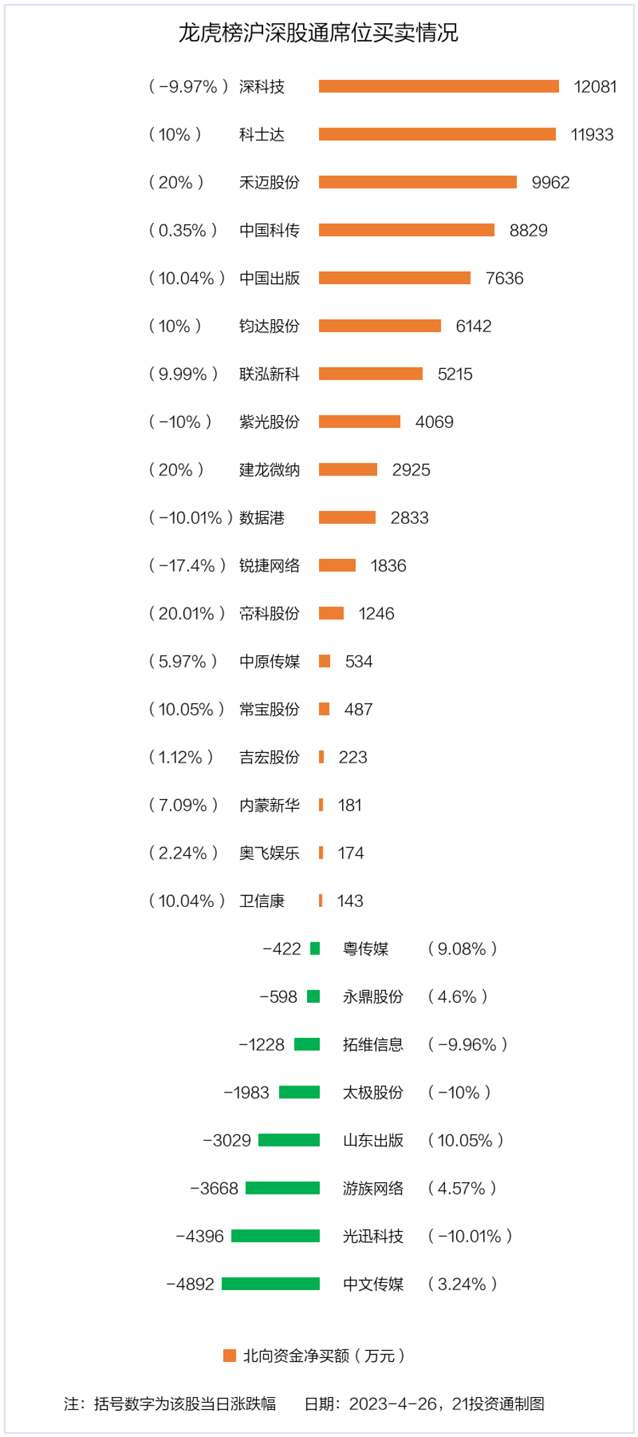 4月26日,北向资金参与龙虎榜中的个股共有26只,合计净买入5.62亿元。其中沪股通净买入7 股,净卖出3 股,合计净买入2.4亿元;深股通净买入11股,净卖出5 股,合计净买入3.22亿元。