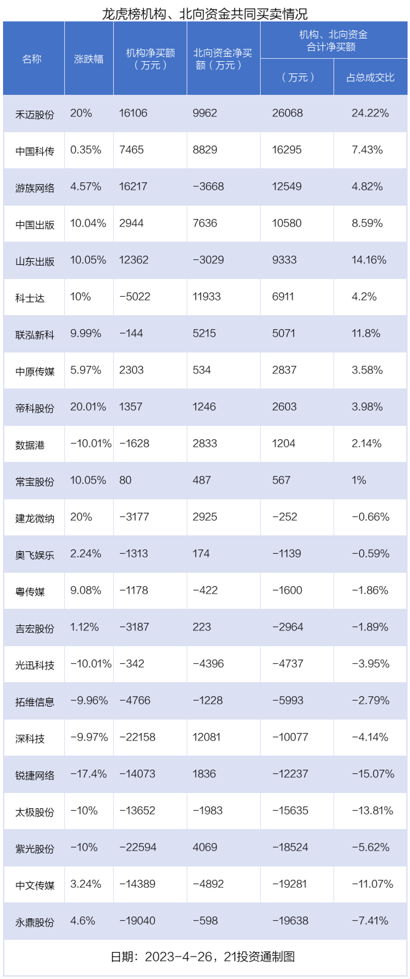 值得注意的是,机构和北向资金共同净买入了禾迈股份、中国科传、中国出版、帝科股份、中原传媒、常宝股份等6股;共同净卖出了粤传媒、永鼎股份、拓维信息、太极股份、光迅科技、中文传媒等6股;在深科技,科士达,联泓新科,紫光股份,建龙微纳,数据港,锐捷网络,吉宏股份,奥飞娱乐,山东出版,游族网络上出现分歧。