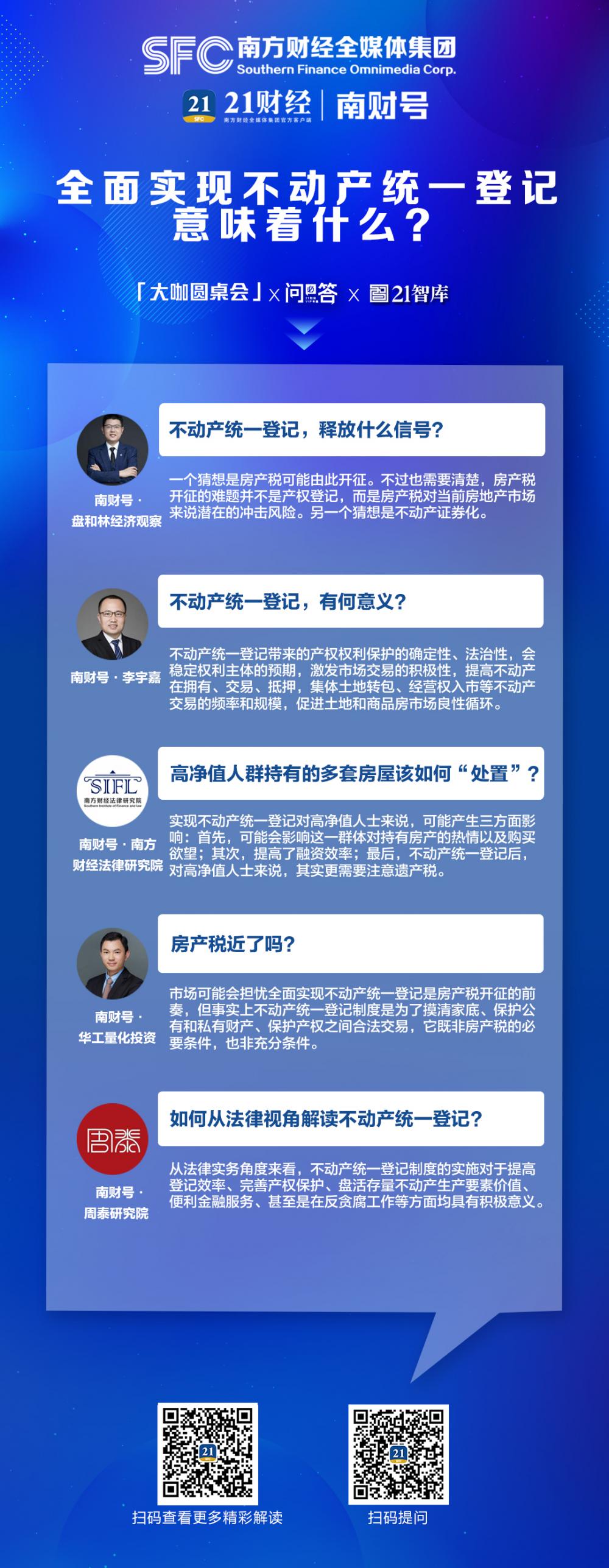 4月25日,自然资源部部长王广华宣布,我国全面实现不动产统一登记。这意味着经过十年努力,从分散到统一,从城市房屋到农村宅基地,从不动产到自然资源,覆盖所有国土空间,涵盖所有不动产物权的不动产统一登记制度全面建立。实施不动产统一登记,目的何在?影响几何?南财号《大咖圆桌会》联合21财经VIP“问必答”、21智库,为您解读。
