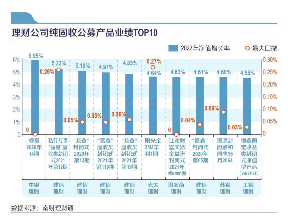 在2022年理财公司纯固收产品收益排行榜中,有6家理财公司的产品进入前十榜单,分别是中银理财、建信理财、光大理财、渝农商理财、苏银理财和工银理财。
