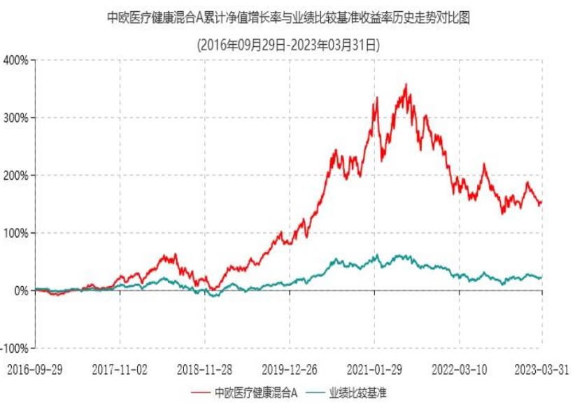 业绩上。以中欧医疗健康A为例,自2016年9月29日成立以来,该产品累积回报(截止3月31日)149.81%,同期业绩比较基准收益率 21.09%。其中:今年第一季度回报为-3.96%,与业绩基准0.57%相比,跑输4.53个百分点。