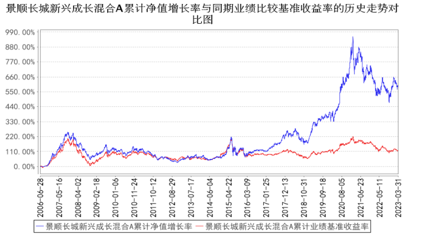 业绩上,以景顺长城新兴成长A为例,自2006年6月28日成立以来,该产品累积回报(截止3月31日)596.98%,同期业绩比较基准收益率为 119.31%。 其中:今年第一季度回报为0.71%,与业绩基准3.24%相比,跑输2.53个百分点。