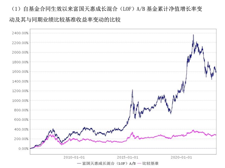 业绩上,以富国天惠成长混合(LOF)A/B为例,自2005年11月16日成立以来,该产品累积回报(截止3月31日)1615.69%,同期业绩比较基准收益率为284.65%。 其中:今年第一季度回报为3.97%,与业绩基准3.34%相比,跑赢0.63个百分点。