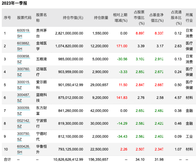重仓股上。对比去年底,蓝晓科技、金域医学为新晋十大重仓股。