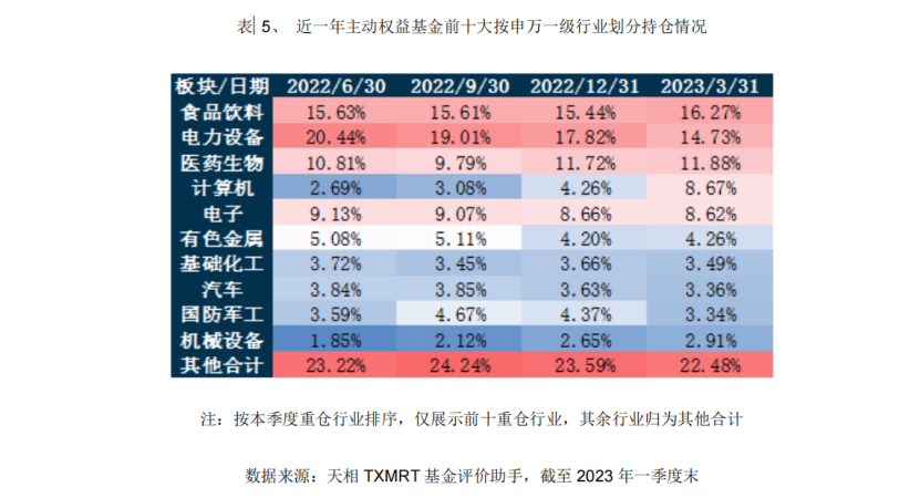 持仓行业方面,根据天相投顾数据,截止今年一季度末,主动权益基金重仓的前三个行业分别是食品饮料、电力设备和医药生物,持仓比例均超过10%。