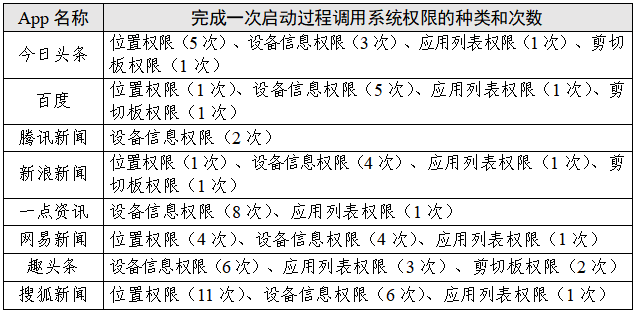 根据测试,在启动App场景中,调用系统权限种类最多的为今日头条、百度、新浪新闻(均为4类),调用系统权限次数最多的为搜狐新闻(18次)。调用系统权限种类最少的为腾讯新闻,仅调用设备信息权限1类权限2次。