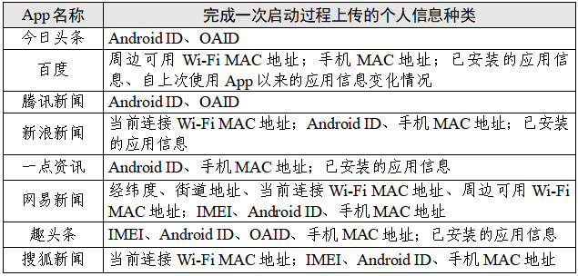 同时,启动App时,个人信息上传种类最多的为百度和新浪新闻(均为3类)今日头条和百度新闻则均上传了Android ID、OAID这1类唯一设备识别码个人信息。