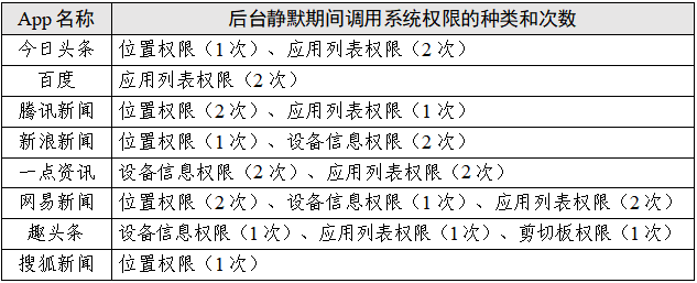 根据测试结果,在后台静默场景中,调用系统权限种类最多的为网易新闻和趣头条,均调用了3类;调用系统权限次数最多的为网易新闻,为5次:分别是位置权限2次、设备信息权限1次、应用列表权限2次。