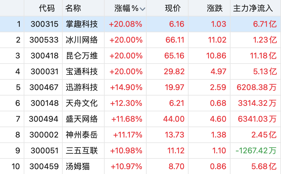 AI、游戏、传媒板块再掀涨停潮,昆仑万维、万兴科技、银之杰、汉仪股份、顺网科技、福昕软件、财富趋势20cm涨停。