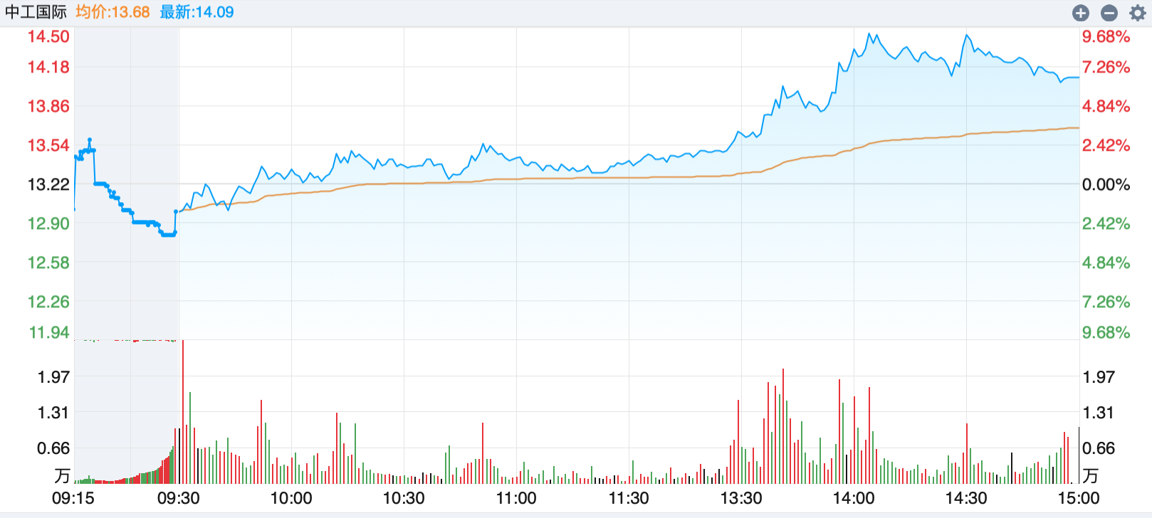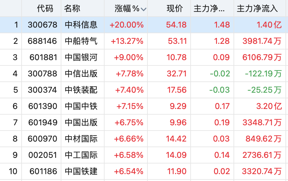中工国际、中文传媒冲击涨停,中国交建、中国铁建、中国建筑等跟涨。