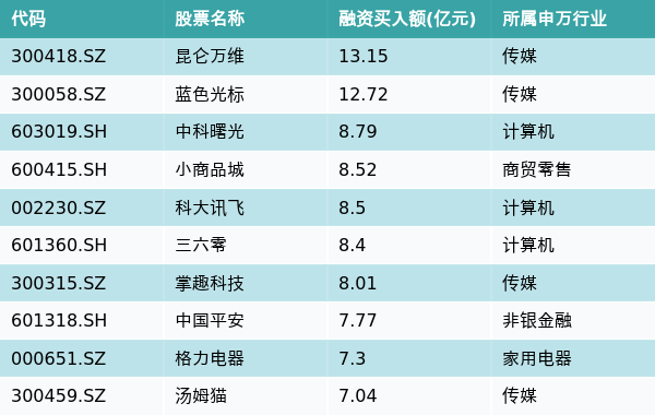 5月4日,两市共有3133只个股有融资资金买入,其中昆仑万维、蓝色光标、中科曙光排名前三,买入金额分别13.15亿元、12.72亿元、8.79亿元。融资买入额前10个股详情见下表: