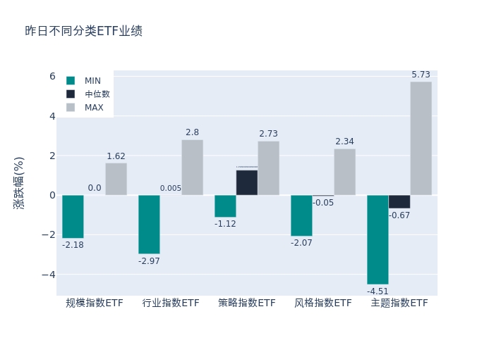 昨日股票型ETF收益率中位数为-0.33%。其中按照不同分类,规模指数中300价值A收益率最高,为1.62%;行业指数中华夏金融ETF收益率最高,为2.8%;策略指数中嘉实沪深300红利低波动ETF收益率最高,为2.73%;风格指数中招商中证银行AH价格优选ETF收益率最高,为2.34%;主题指数中广发中证传媒ETF收益率最高,为5.73%。
