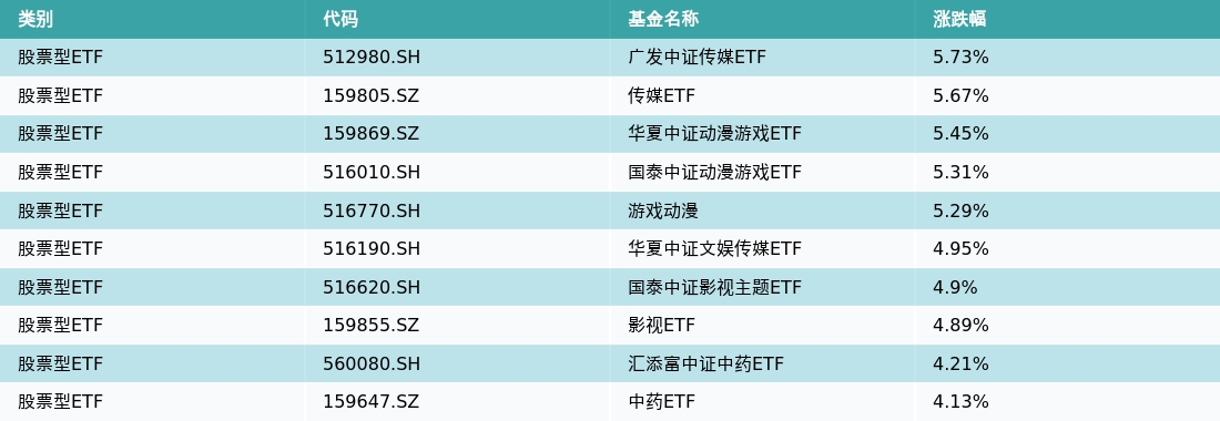 昨日股票型ETF涨幅最高的3支ETF及其收益率分别为:广发中证传媒ETF(5.73%)、传媒ETF(5.67%)、华夏中证动漫游戏ETF(5.45%)。涨幅前10详情见下表:
