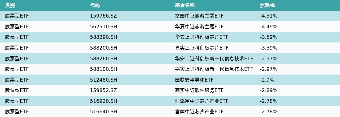 昨日股票型ETF跌幅最大的3支ETF及其收益率分别为:富国中证旅游主题ETF(-4.51%)、华夏中证旅游主题ETF(-4.49%)、华安上证科创板芯片ETF(-3.59%)。跌幅前10详情见下表: