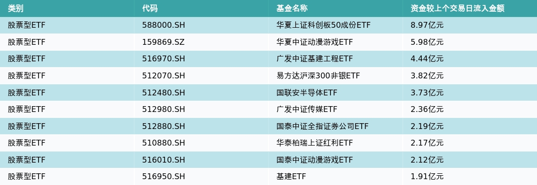 昨日股票型ETF资金流入最多的3支ETF及其流入金额分别为:华夏上证科创板50成份ETF(流入8.97亿元)、华夏中证动漫游戏ETF(流入5.98亿元)、广发中证基建工程ETF(流入4.44亿元)。资金流入前10详情见下表: