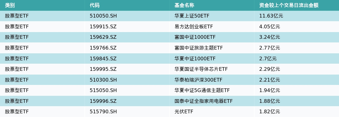 昨日股票型ETF资金流出最多的3支ETF及其流入金额分别为:华夏上证50ETF(流出11.63亿元)、易方达创业板ETF(流出4.05亿元)、富国中证1000ETF(流出3.24亿元)。资金流出前10详情见下表: