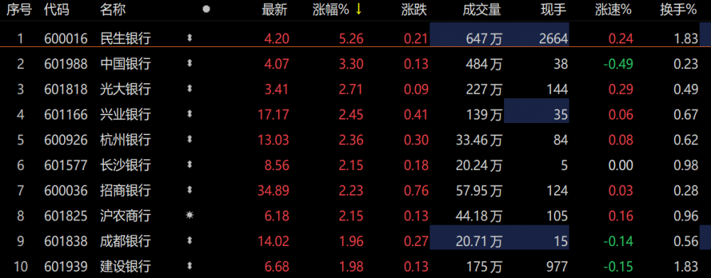 涨幅方面,银行板块涨幅更为明显,其中,民生银行涨超5%,中国银行涨超3%,光大银行、兴业银行、杭州银行、长沙银行、招商银行等等涨超2%。
