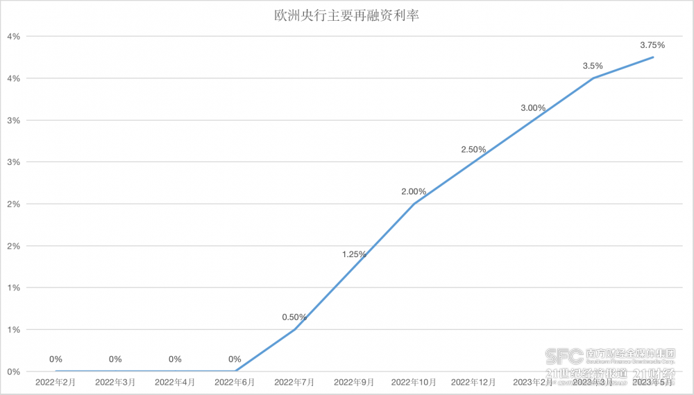 对比来看,欧洲央行将晚于美联储暂停加息。当地时间5月4日,欧洲央行决定将三大关键利率上调25个基点,这一“降级”举措符合市场预期。此前在3月,欧洲央行曾顶着银行业危机压力,兑现了加息50个基点的承诺。从5月10日起,欧洲央行存款便利利率升至3.25%,边际贷款利率升至4.00%,主要再融资利率升至3.75%,达到2008年10月以来的最高水平。