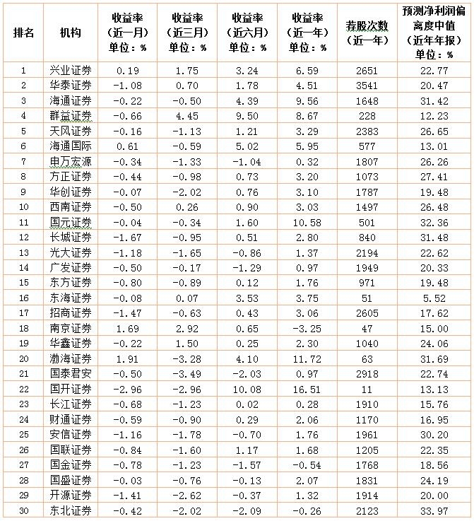 投资快报投研通券商研究实力榜数据显示,4月券商研究实力榜前3名分别是兴业证券、华泰证券、海通证券。排名第1的兴业证券最近一年荐股2651次。近一个月、三个月、六个月和近一年收益率分别为0.19%、1.75%、3.24%和6.59%。近年年报预测净利润偏离度中值为22.77%。