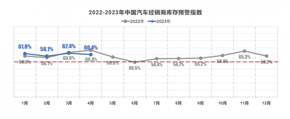 中国汽车流通协会发布的最新一期“中国汽车经销商库存预警指数调查”VIA(Vehicle Inventory Alert Index)显示,2023年4月中国汽车经销商库存预警指数为60.4%,同比下降6.0个百分点,环比下降2.0个百分点,库存预警指数位于荣枯线之上,汽车流通行业处于不景气区间。